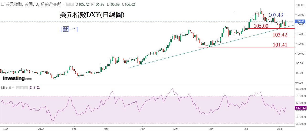 见下方[图ㄧ]美元指数DXY(日线图),红线为下跌支持,蓝线为上升阻力。