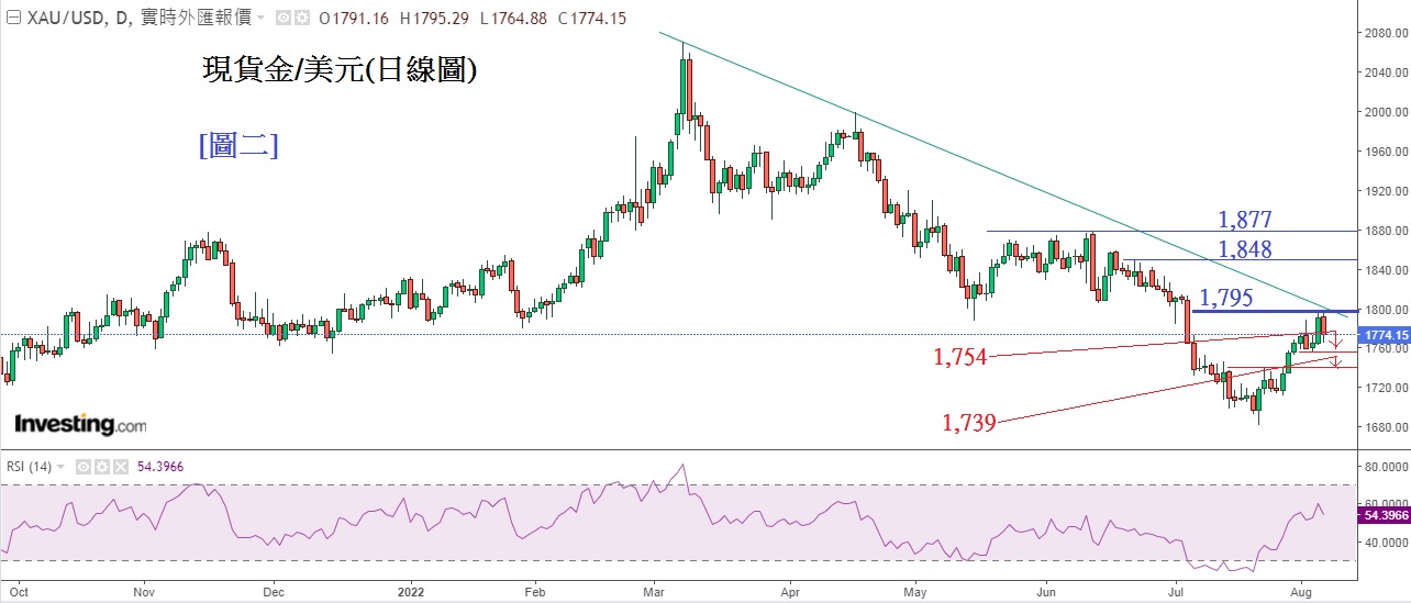 技术分析方面,见下方[图二]现货金/美元(日线图), 解放军在台军演于周日(7日)结束,金价或因紧张局势暂时舒缓而稍作回落,本周市场焦㸃在周三晚的美国CPI结果。