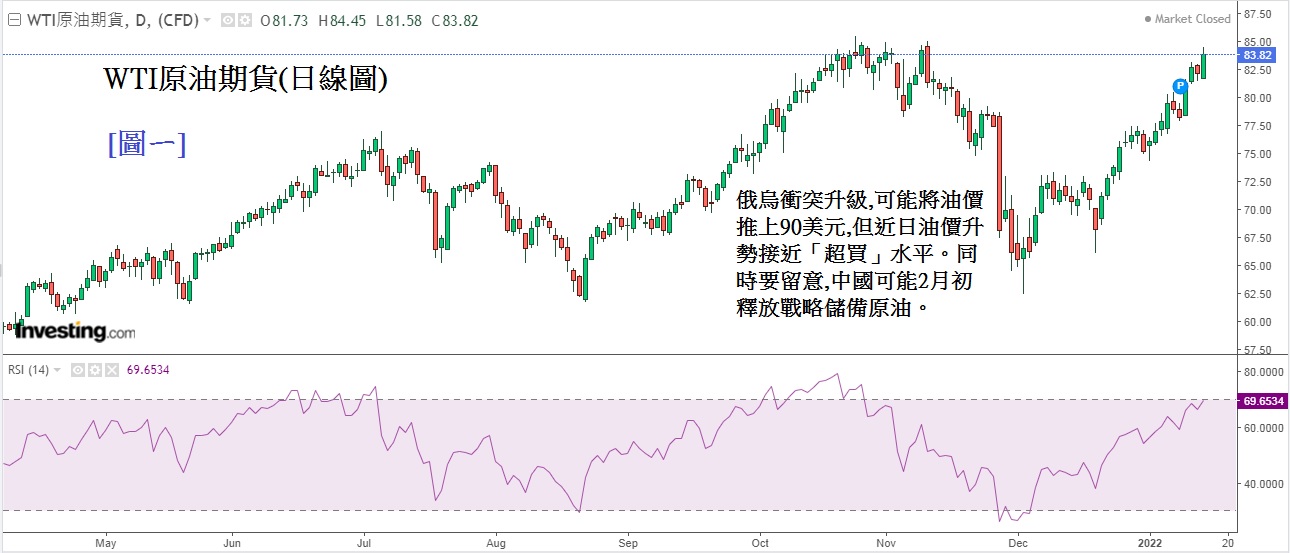 本周紧张气氛料持续,预计油价可能上试90美元/桶或更高。虽然油价看涨,但要留意,中国可能在农历新年期间释放其战略储备原油。同时要留意,见[图ㄧ]WTI原油日线图,近日油价的升势已升近「超买」水平,目前RSI水平是69.65。本周欧美继续与俄罗斯谈判,若谈判出现少许曙光,油价随时出现大幅回落,因此密切留意本周俄乌的发展。