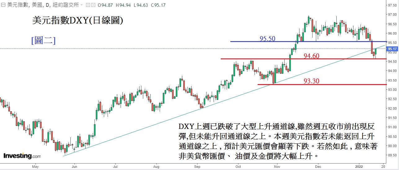 见[图二] 美元指数(DXY)日线图,图中可见,技术上美元指数上周已跌破了大型上升通道线,周五收市前虽然出现反弹,但未能升回通道线之上。本周美元指数若未能返回上升通道线之上, 预计美元汇价会显著下跌。若然如此,意味着非美货币汇价、油价及金价将大幅上升。