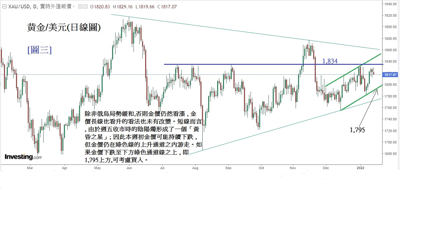 见[图三]黄金/美元日线图,除非俄乌局势缓和,否则金价仍然看涨,长线也看升的看法也未有改变。