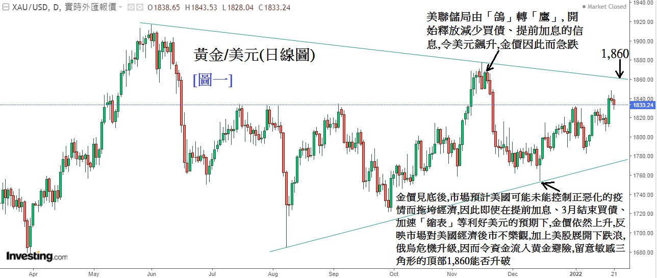 美国通账现高企在7%,而美国12月份的数据九成都造差。在通胀持续上升但经济表现下滑的情况,市场都担心美国或会陷入「滞胀」。在美国未能控制疫情下, 市场 预计未来美国经济 在今年会持续下滑。因此大家可以从[图ㄧ]黄金/美元日线图看得到,从12月至今,美联储局不断释放提前加息。今年加息次数增加、 加快「缩表」等等对黄金不利的消息,本应对美元上升有利,不利金价。但金价自12月中开始持续上升,反映市场对美国经济发展今年不抱有信心,主因都是美国未能控制疫情,是经济增长的大障碍。因此即使美国加息周期快将启动但仍对美元不抱信心,反而增持黄金。
