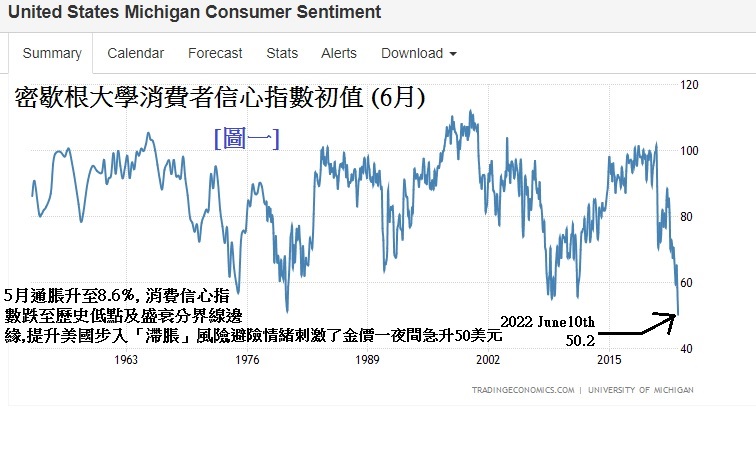 上周五美国公布的年通胀率升至8.6%,反映了拜登在3月取消了300多项对中国进口商品关税,以及自3月 联储局开始加息,两个动作似乎未能压制持续上升的通胀。当晚同时也公布了 6月密歇根大学消费者信心指数,结果是由5月58.4大幅下滑至50.2,为历史低点。可参考下方[图一]密歇根大学消费者信心指数过去历史表现,6月跌至50.2,已触及到盛衰分界线,反映美国消费市场开始走向低迷。而本周三(15日)联储局将再加息0.5%,同时开始每月减少买债475亿美元,预计将令美国经济增长进ㄧ步转弱、令美国经济陷入衰退及「滞胀」的机会大大提升。因此周五晩公布了疲弱的消费信心数据及甚高的通胀率后,避险资金将金价在5小时内推升近50美元,当晚由1,825美元升上最高1,875美元,最后收在1,871美元。