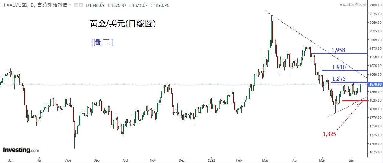 见下方[图三]黄金/美元(日线图) ,上周五金价收市时的「阳烛」颇长,因此技术上金价本周仍看升为主,但要留意本周三(15日)美联储局议息,预计将会加息0.5%及启动每月减少买债475美元,可能会令美元汇价回升、金价回吐。由于这个预期已炒作多时,因此料金价回吐空间有限,留意下方1,825美元重要主持位。