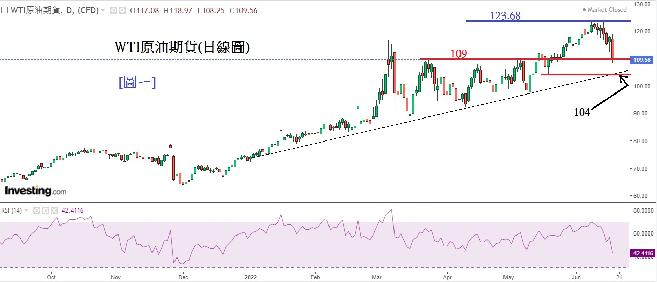因此,即使上周五(17日)WTI原油当晚从118美元/桶急跌至108美元/桶,跌幅近10美元,但相信这ㄧ跌只是短暂性,进一步再跌的空间相信有限。见下方[图ㄧ]WTI原油期货(日线图),周五当晚市场传出油组(OPEC+)或响应拜登提出的大幅增产要求,消息令油价插水近10美元。技术上,油价仍在运行了半年的上升信道之上,留意信道底部104美元/桶重要支持位会否失守。不过,由于制裁下能源供应仍受影响,加上环球极端天气令能源需求增加,因此认为油价再下跌空间有限。相反,预计油价有随时回升的可能。