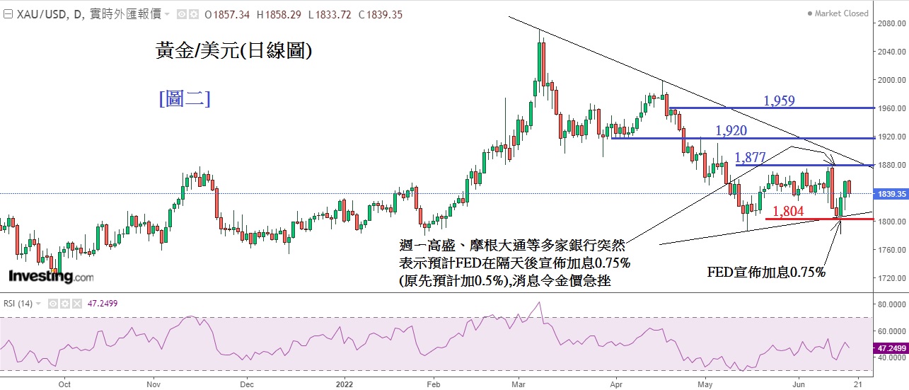 FED于周三(15日)宣布加息0.75%令美元上升,金价及非美货币下跌,但同ㄧ晚上美国亦公布了5月零售销售Retail Sales,结果是 -0.3%(4月是+0.7%),零售销售出现负增长反映美消费市场疲弱。继5月的密芝根大学消费信心指数由58.4急挫至50.2(即盛衰分界线边缘)及第1季GDP录得萎缩1.5%,近期美国重头数据都相继造差,令市场相信美国越大幅加息及「收水」,将会加快令美国经济进入衰退或陷入「滞胀」。因此当宣布了加息0.75%后金价反而上升,似乎市场担心美国经济已渐入衰退而选择抛售美元买入黄金避险。