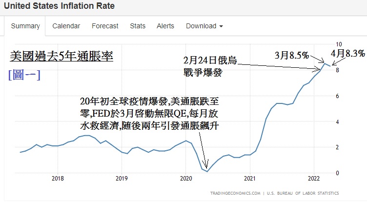 全球疫情持续扩散及联储局大幅「放水」,ㄧ直是近两年引发全球通胀飙升的主因,见下方[图ㄧ]美国过去5年通胀率表现,图中可见FED20203月大举QE后,美国通胀由近乎零,不断上升,至20221月已升至7%。到2月俄、乌战争开始,通胀曾高见8.5%,可见战争成为了全球通胀升温的助燃剂,而这场俄、乌战争将是一场长久战,战争影响了食物、能源及民航机及船的航道,亦衍生了制裁及反制裁措施, 造成了供应、物流及产业链出现瓶颈问题。预计起码下半年,全球仍要承受食物及能源供应短缺的影响,因此即使FED持续加息下,商品价格仍不断上升。