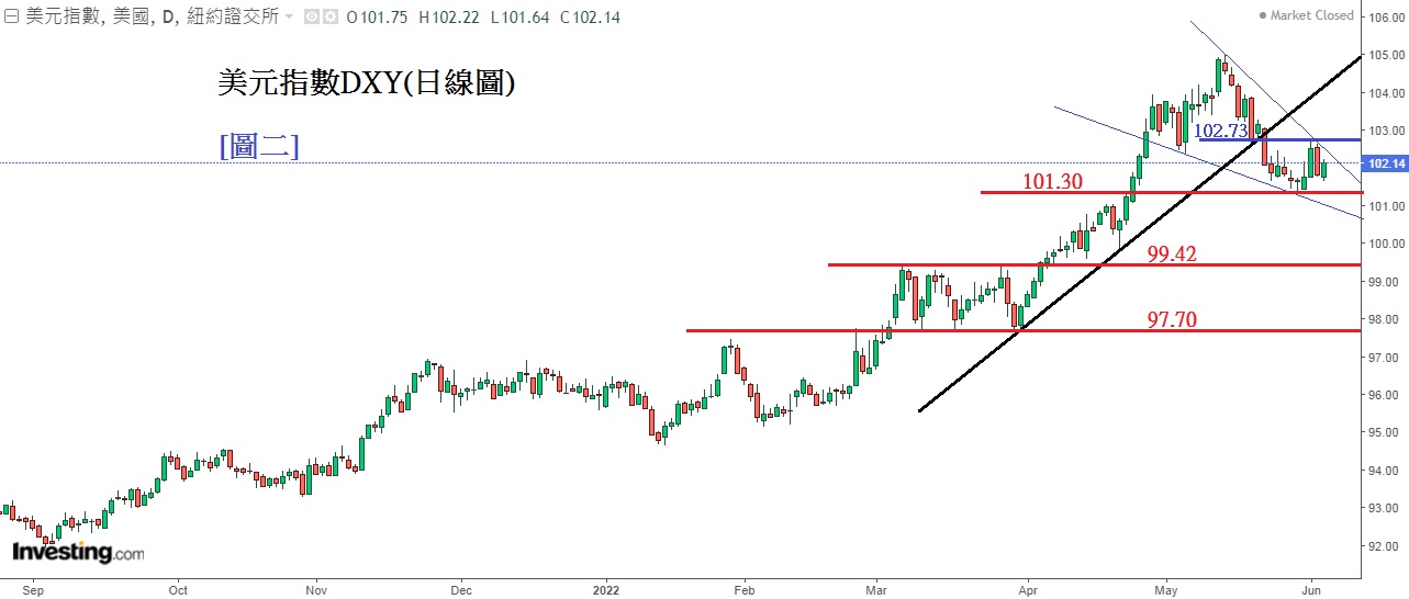 技术分析方面,见下方[图二]美元指数DXY日线图,蓝色粗线为上升阻力,红色粗线为下跌支持。美元指数于前周跌破了上升通道线(黑色粗线))后,随后在101.30上方游走并形成了ㄧ个「向下三角形」(蓝色幼线),显示DXY后市倾向往下走机会颇大,意味着本周美元汇价下滑,金、油及非美货币上升。