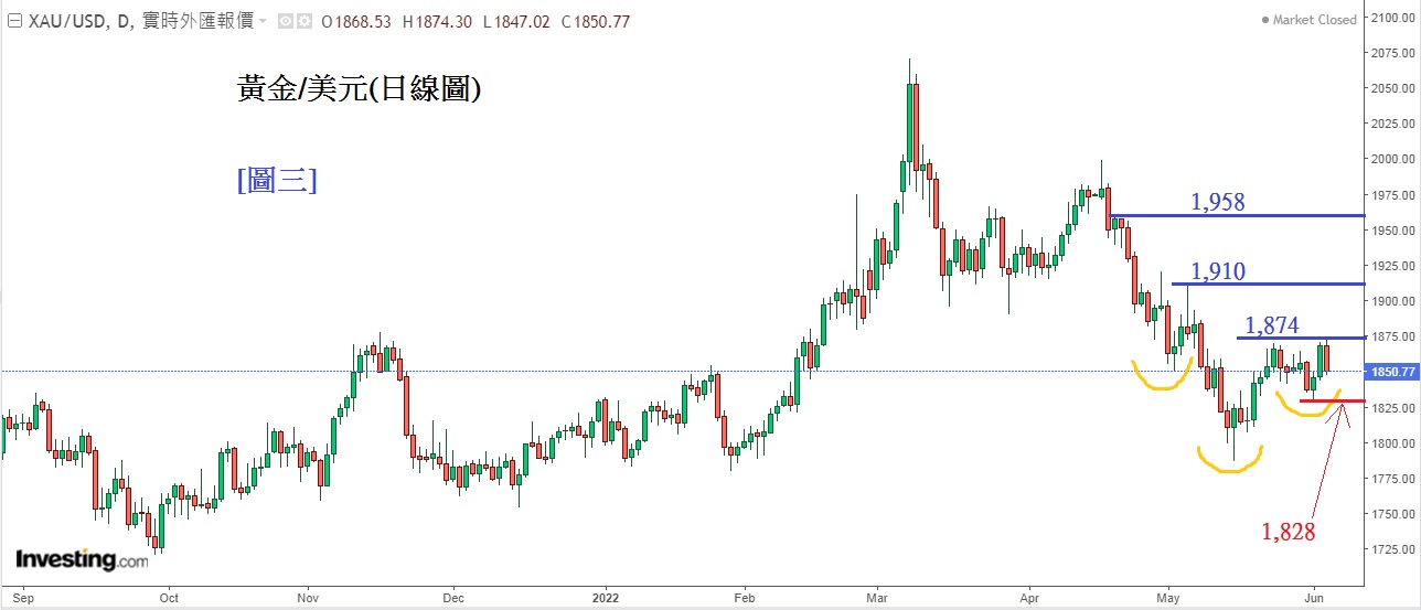 见下方[图三]黄金/美元日线图,蓝色粗线为上升阻力,红色粗线为下跌支持。