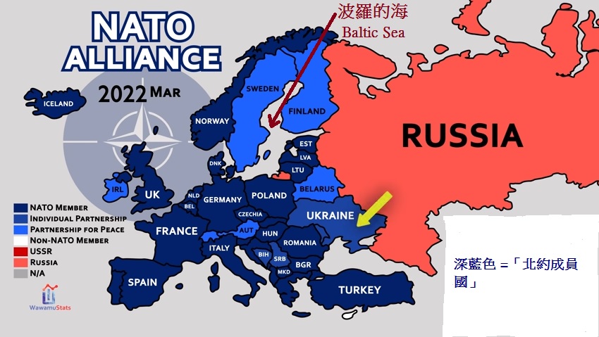 快将今年内加入「北约」的瑞典及芬兰,形势变为近乎整个波罗的海将被「北约」(即美国)控制,因波罗的海北面是瑞典及芬兰,东面是俄罗斯,而南面是已属「北约」的爱沙尼亚、拉脱维亚、立陶苑及波兰(请参考下方北约成员国分布图),形势对俄罗斯构成了相当的威胁,看来波罗的海快将会风云四起。依赖波罗的海运出原油及粮食的俄罗斯货船将受到威胁,预计俄军将会在波罗的海沿岸加强军事部署,这个紧张形势发展下去,对金、油及商品有推升作用。