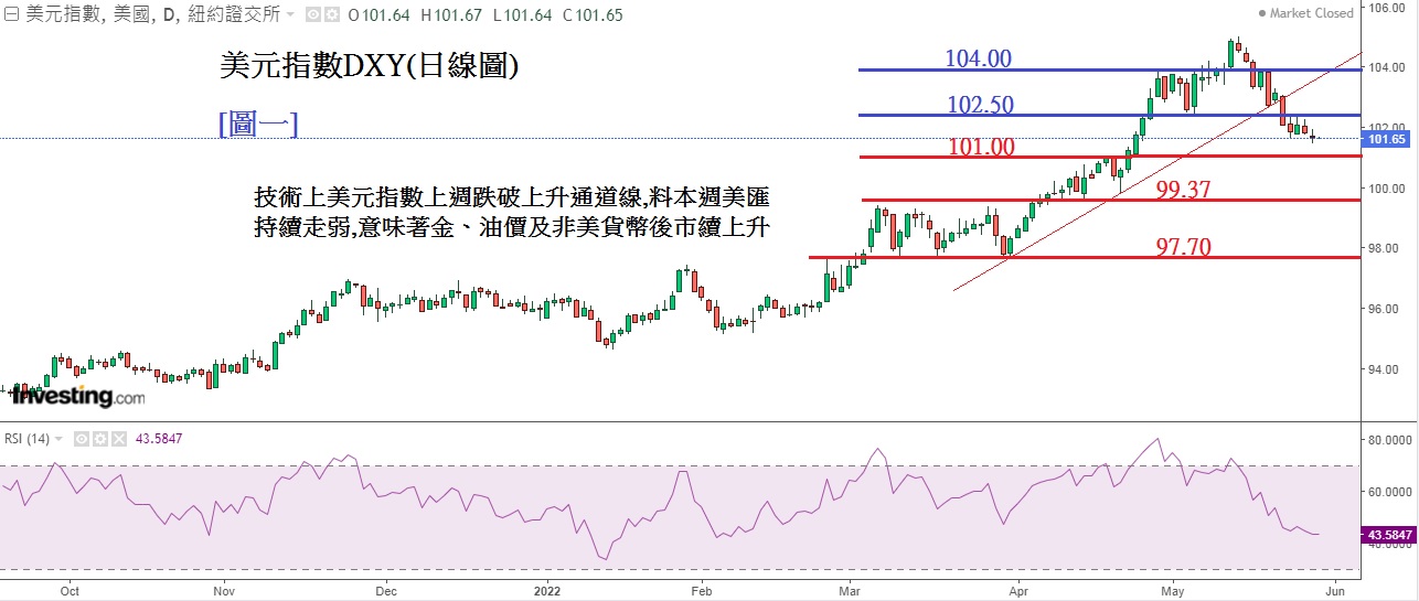 在技术分析上,见下方[图ㄧ]美元指数DXY日线图: 蓝色粗线为上升阻力,红色粗线为下跌支持。DXY在上周ㄧ(23日)跌破维持了3个月的上升通道线,从图上看,DXY跌势似只是刚开始,RSI(14日)是43.58,未算「超卖」,反映仍有下跌空间。若推断正确,意味着本周金、油及非美货币会显著上升。