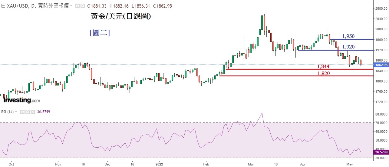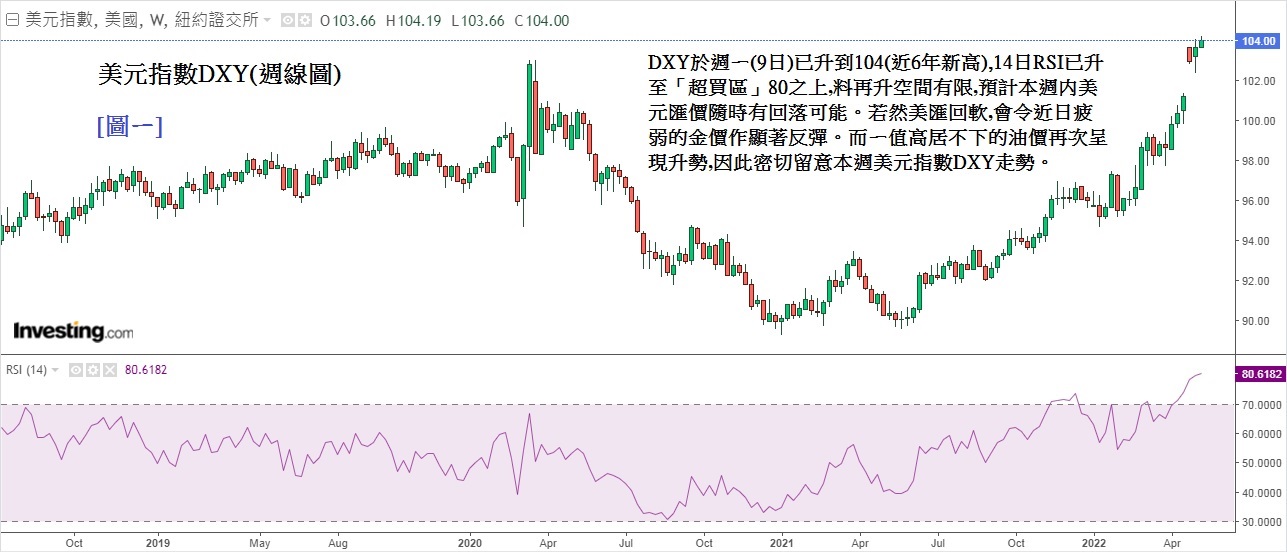 上周FED除了加息0.5%外,令市场意外的,是「缩表」推迟到6月才启动;金额亦有下调,FED在6、7、8月将每月减少买债475亿美元,到9月才减少买债950亿美元,与鲍威尔之前所说的每月「缩表」950亿为少。因此当晚美元曾短暂回落及美股也曾反弹。但市场认为FED仍在「收水」,始终是对股市不利,加上美国经济近日表现转差,GDP又现萎缩1.4%。尽管周五晚美国公布4月非农数据结果比预期略为造好,但市场已开始抛售美股,美元亦持续上升。见下方[图ㄧ]美元指数DXY(周线图),可见上周及前周,美元汇价升势非常凌厉,DXY于周ㄧ(9日)已升到104(近6年新高),14日RSI已升至「超买区」80之上,料再升空间有限。预计本周内美元汇价随时有回落可能,若美汇回软,会令近日疲弱的金价作显著反弹。而ㄧ直高居不下的油价再次呈现升势,因此密切留意本周美元指数DXY走势。