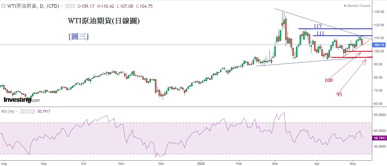 见下方[图三]WTI原油期货(日线图), 蓝线为上升阻力, 红线为下跌支持。