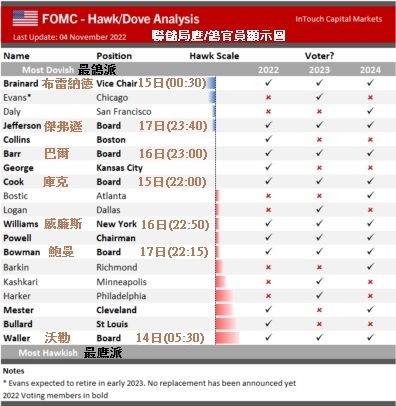 市场关注联储局官员演说方面,本周将有颇多的官员演说,见下方显示图,本周将有7名官员发表演说。同时可在此显示图看到19位官员的鹰、中立、鸽取向, 一目了然。图中可见「偏鹰派」仍占大多数,因此要特别留意「偏鹰派」官员有否「转鸽」或转至「中立」。若有,美元会进ㄧ步下跌。 本周将发言的7位官员的日期及时间也在列表上有显示,他们在20222023年均有投票权,故他们言论有着举足轻重的份量。因此,密切留意他们本周的言论。
