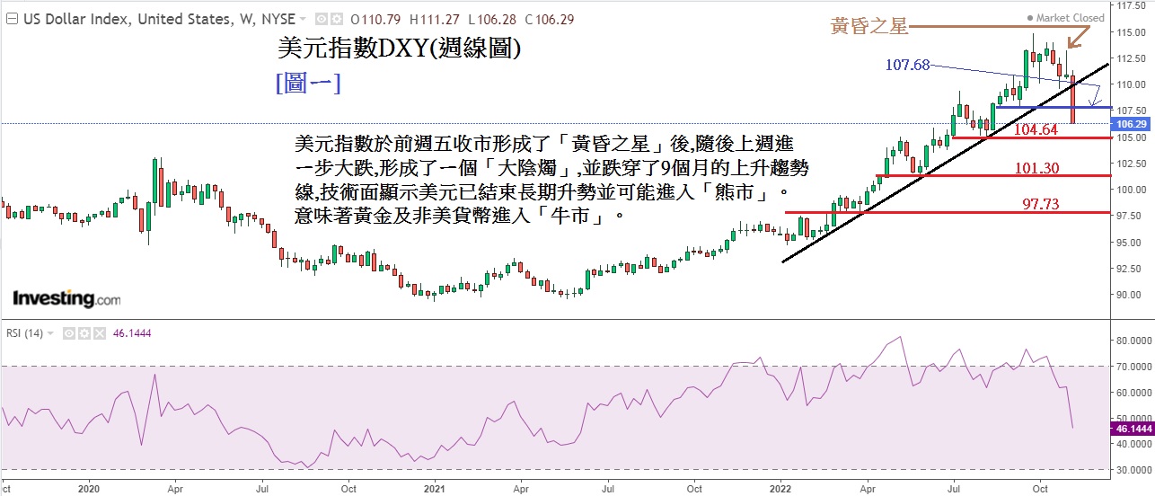 见下方[图ㄧ]美元指数DXY(周线图),美元指数于前周五(4)收市形成了颇长形的「黄昏之星」形态后,随后的ㄧ周(即上周) 美元指数进ㄧ步大跌,形成了ㄧ个「大阴烛」,并跌穿了9个月的上升趋势线,而且跌穿后向下伸延幅度相当深,故相信「假穿」成份不高。技术面显示美元已结束9个月升势并进入「熊市」(即未来数月下跌机率相当高) 这意味着黄金及非美货币进入「牛市」。