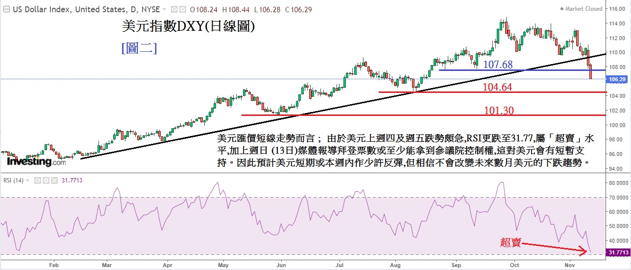 美元汇价短线走势而言见下方[图二] 黄金/美元(日线图),由于美元上周四及周五跌势颇急,RSI更跌至31.77,属「超卖」水平,加上周日 (13)媒体报导拜登票数或至少能拿到参议院控制权,这对美元或有短暂支持。因此预计美元短期或本周内会作少许反弹,但相信不会改变未来数月美元的趋势。