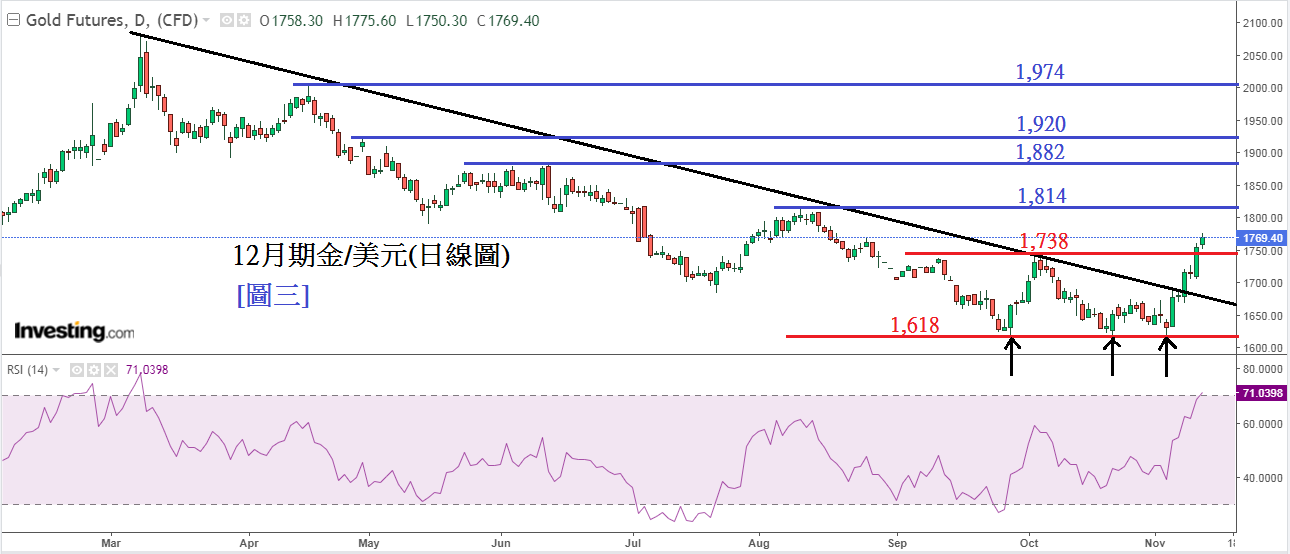 见下方[图三] 12月期金/美元(日线图),金价3次在1,618美元尝试跌破但不成功,令金价于1,618美元建立了「三底」(Triple Bottom) 比之前的「双底」更巩固了金价的底部,导致金价后市上升释出了更强烈的上升訉号,金价上周更升破维持了9个月的下跌趋势线,预计金价后市至少会维持9个月升势,目前上方第一个阻力是1,814美元,继而是1,882美元及1,920美元。