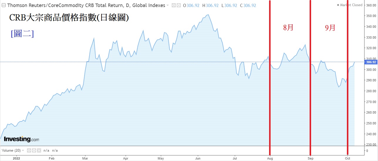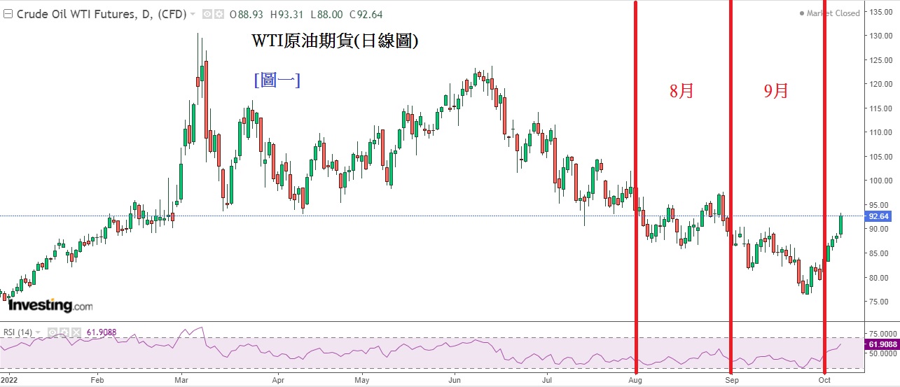 为何认为此次CPI结果可能会低于预测的8.1% ? 主因是看到9月份能源及其他商品价格都较8月为低。能源价格方面,美国WTI原油及英国布兰特原油价格在整个9月份都处于下行。见下方[图一]WTI原油期货(日线图),以WTI原油为例, 整个9月份都处于90美元/桶以下,最低更低至76.50美元/桶,相比8月最高曾见97.66美元/桶,9月份油价明显回落不少。