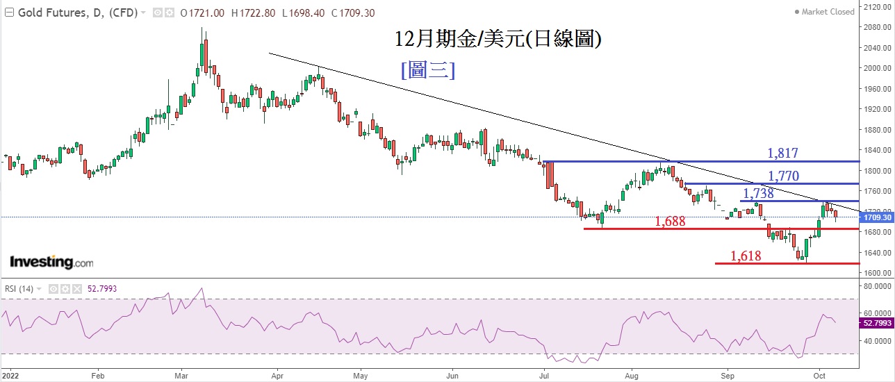 周五晚美国公布了一系列就业数据,市场最关注的9月非农业新增职位预测是增加25万个,8月是增加31.5万个,9月的结果最终是增加26.3万个,数据较预测造好,比8月份较差。9月失业率结果是3.5%, 比8月的3.7%为低。当晚数据公布后支持了美元汇价上升,非美货币及金价回落。12月期金上周最高曾升至1,738美元,随后连跌三日,周五晚在1,709美元收盘,仍站在重要支持关口1,700美元之上。