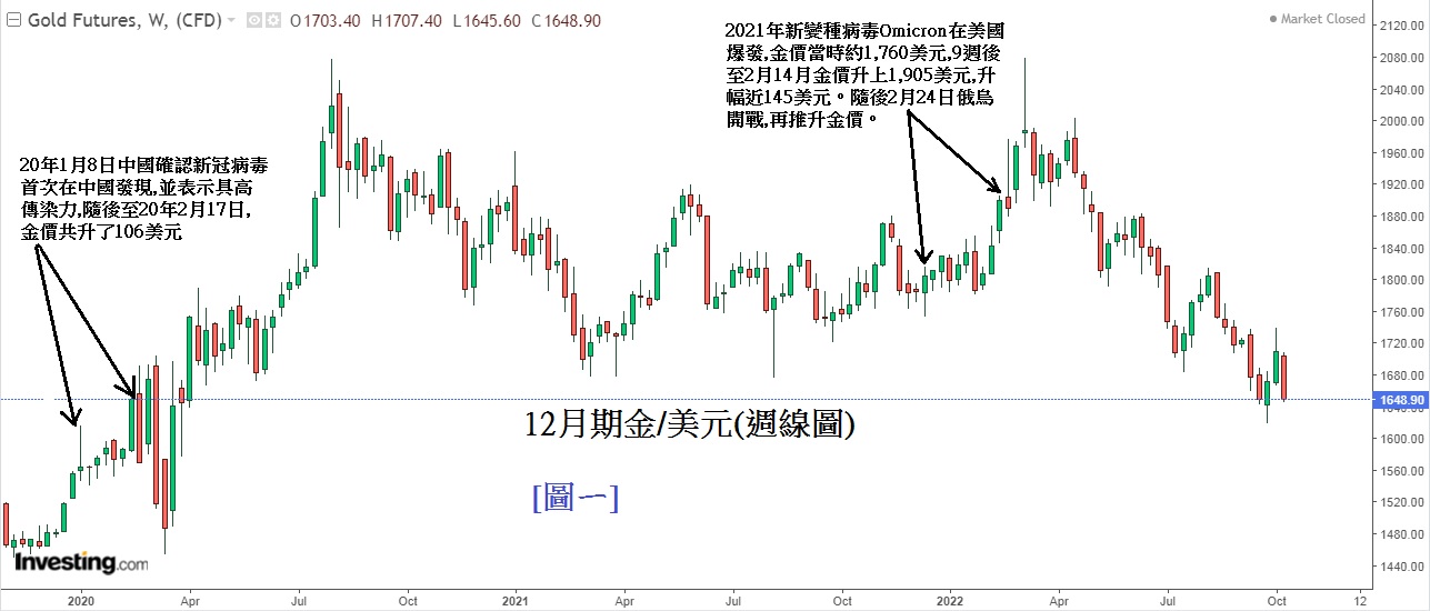 值得留意的是,见下方[图ㄧ] 12月期金/美元(周线图)。在过去近3年,每逢出现疫情爆发及新变种病毒大流行,金价都表现升势凌厉,因此密切留意未来BQ.1.1病毒发展。