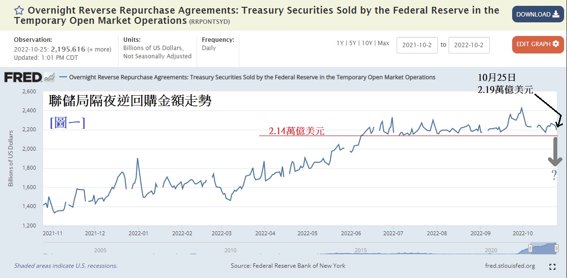 上周五晚反映利率期货走势的CME FedWatch Tool显示12月美国加息0.5%机率由37%跳升至50%之上,令市场揣测FED加息步伐可能减慢。空穴来风未必无因,反映美元流通量的「隔夜逆回购金额」显示亦有所下降,技术上也下跌至关键水平,表示美元流通量逐步增加,美元指数因而回落。FED是否真的放慢加息,有待11月2日FOMC会议揭盅。