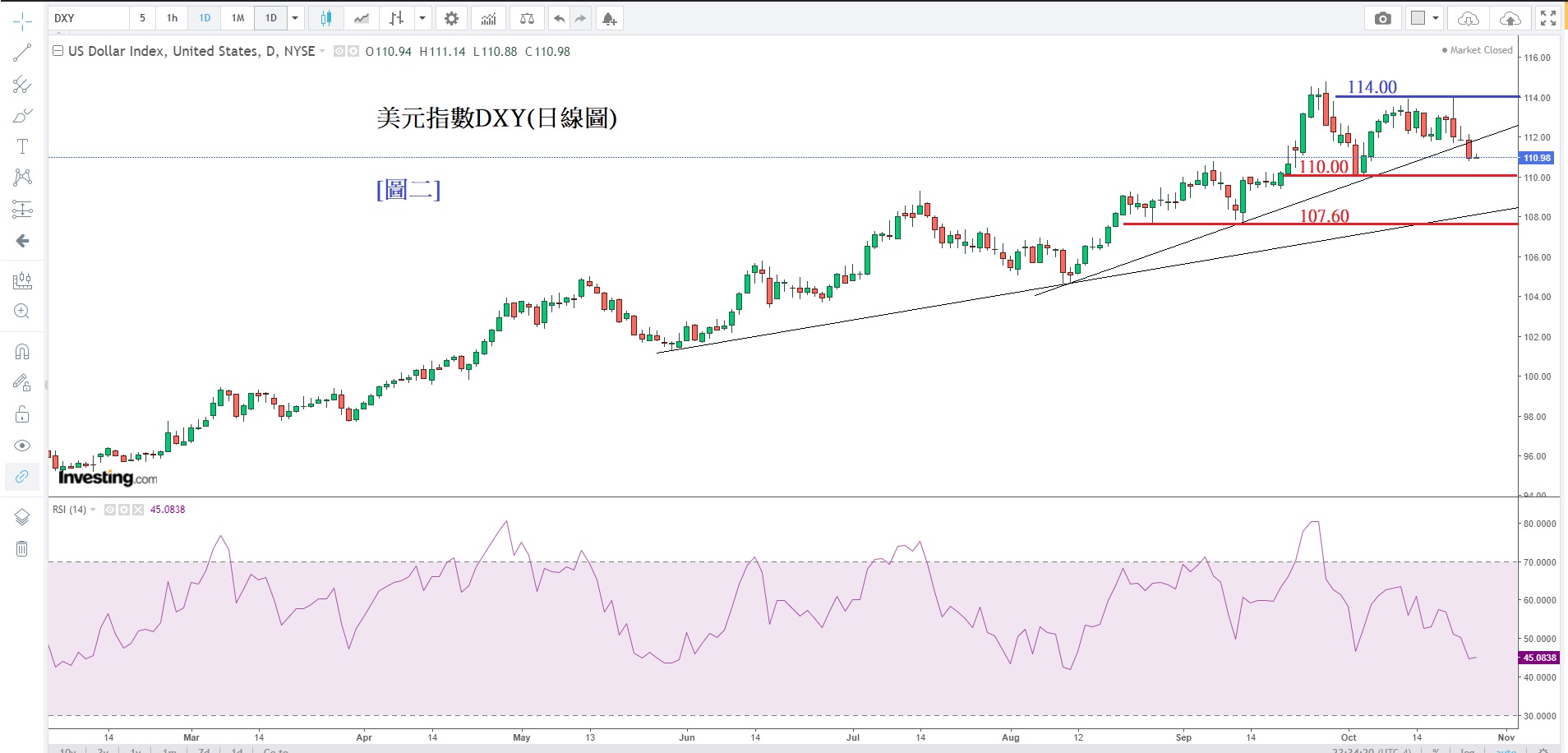 见下方[图二]美元指数DXy(日线图),图中可见美元指数在114.00形成了ㄧ个「双顶」,因此预计美元汇价短期内仍持续回落。