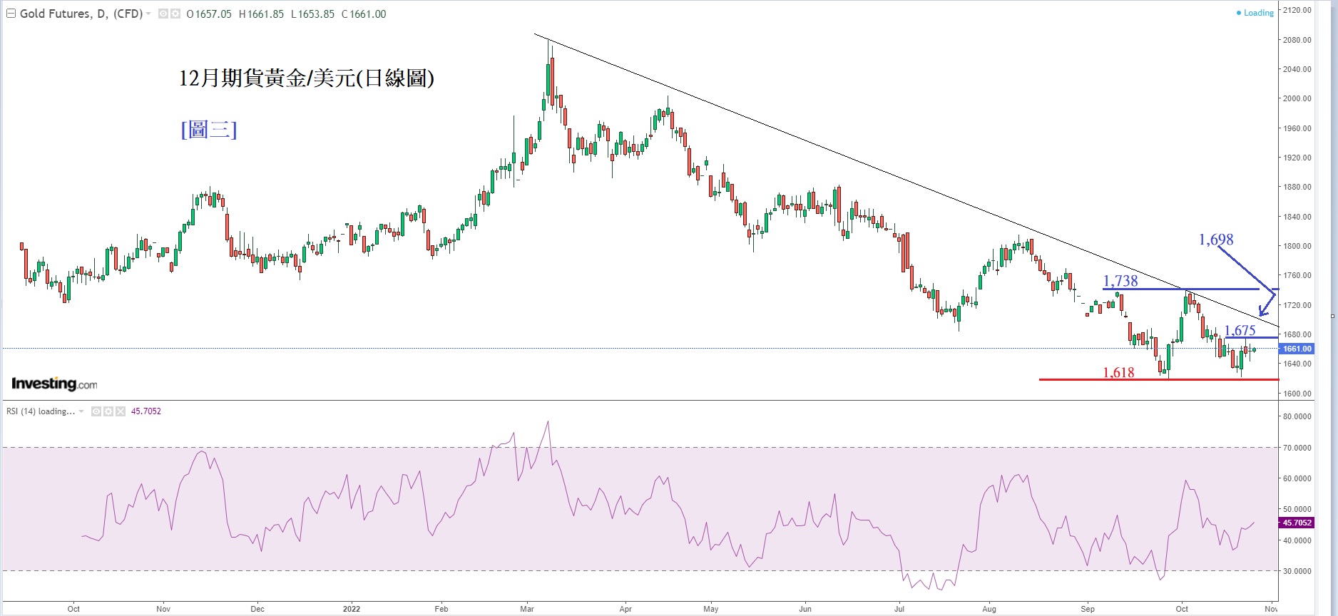 见下方[图三] 12月期货黄金/美元(日线图), 图中可见其金1,618美元形成了ㄧ个「双底」, 预计金价后市上升,上方有个短期阻力1,675美元,而下个重大阻力是1,698美元,1,698美元的位置是从3月以来的下跌趋势线的大阻力。因此,若升破1,698美元,预计金价会形成一个上升趋势。