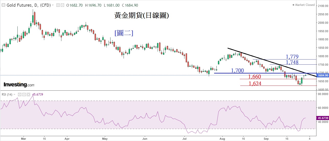 技术分析方面,见下方[图二] 黄金期货(日线图),上周三金价出现大幅反弹,但在周五升近1,700美元水平暂时止步,可见图中,1,700刚好是下降通道的上升阻力线(以黑色粗线显示),而1,700美元同样也是水平线上升助力(以蓝色粗线显示)1,700美元成为了双重阻力,密切留意金价可否在本周突破1,700美元,若能突破,金价将显著上升。图中蓝色线为上升 阻力, 红色线位下跌支持。