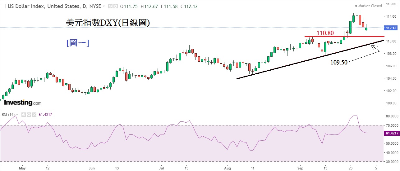 见下方[图一]美元指数DXY日线图,若美元指数持续下滑,下方有个重要支持位110.80(以粗红线显示)。若110.80失守,美元指数下个重要支持位是109.50,这是自8月伸展上来的上升通道支持线(以黑色粗线显示,若然跌破,美元汇价跌势将更显著。