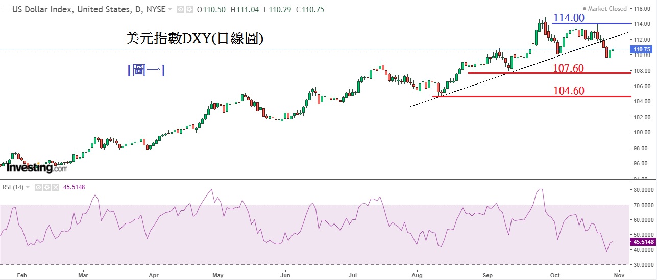 见下方[图一]美元指数(DXY)日线图,图中可见114.00形成了「小双顶」,美元指数在上周二跌破了上升通道支持线(以黑色幼线显示),预计后市会继续下行,周四及周五出现小反弹,现在黑色的上升通道线成为了上升阻力,留意DXY会否重返此上升阻力线之上。若继续下行, 下方支持分别是107.60及104.60。 本周市场焦点是周三的联储局会议,因此料周ㄧ及周二市况淡静。