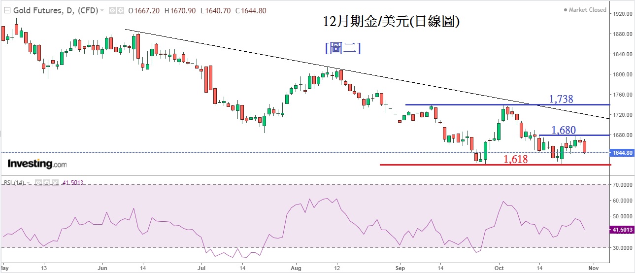 技术分析方面, 见下方[图二] 12月期金/美元(日线图),金价在1,618美元形成了「双底」, 之后作了60美元反弹。上周五美国9月PCE数据结果高于8月,反映通胀仍然上升,市场 担忧联储局或继续激进加息,令美元上升,因此金价于周五晚受压出现显著回落,但「双底」形态仍未破局, 金价后市仍预计上行,但留意下方重要支持位1,618美元, 密切留意本周三鲍威尔「放鸽」或是「放鹰」。
