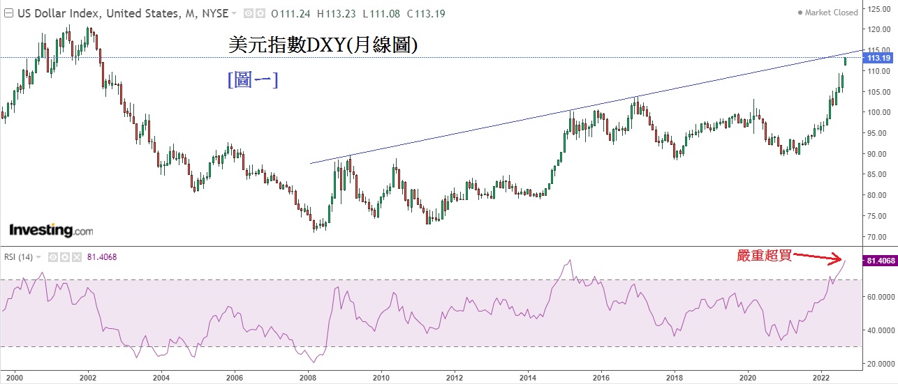 从技术层面来看,由于近日美元升势有点过急,其RSI(Relative Strength Index 相对强弱指数) 在(日线图)的RSI显示升至77,属于「超买」水平。见下方[图ㄧ]美元指数DXY(月线图),在月线图的RSI更升至81。一般而言,RSI在70以上属「 超买区」,低于30以下属「超卖区」,目前DXY的RSI在日线图及月线图均在「超买区」,尤其是月线图升至81,属于严重「超买」,预计美元再上升空间有限,市场过去ㄧ直持有美元的「买盘」,随时会在此高位水平作获利了结,意味着近日跌得厉害的非美货币及商品短期内或作显著反弹。
