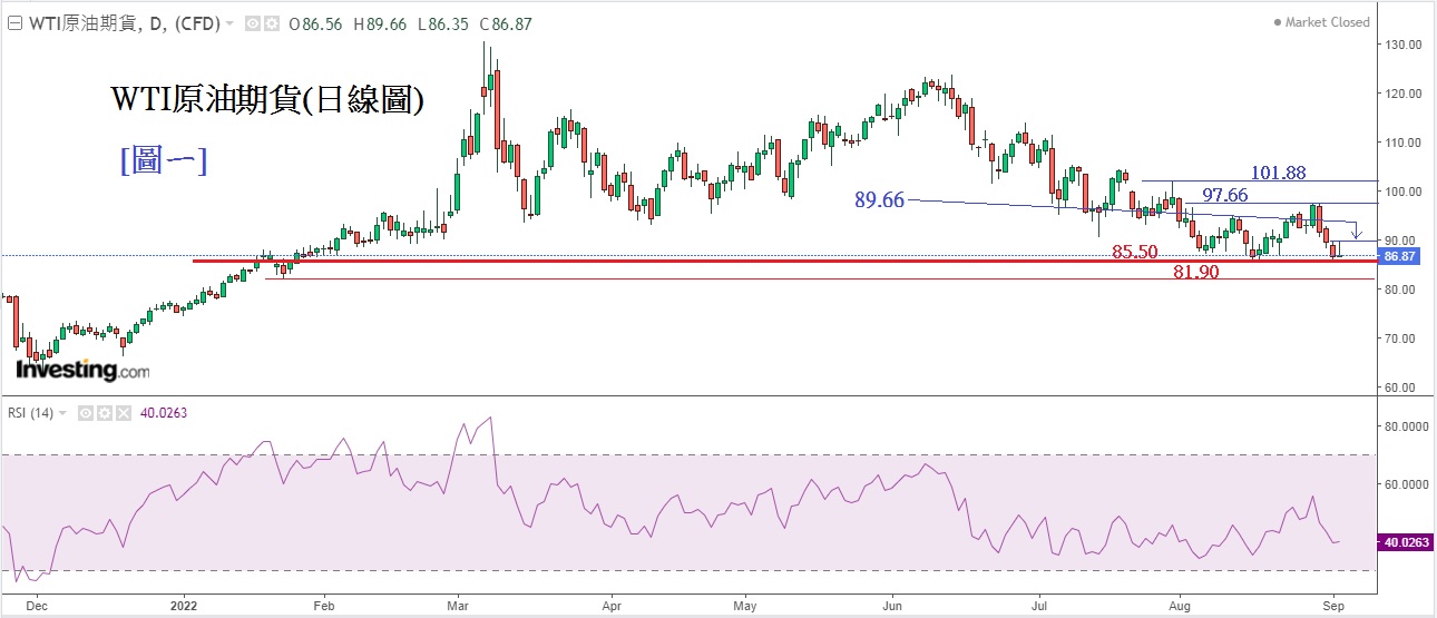 见下方[图ㄧ]WTI原油期货(日线图) ,图中的蓝线是上升阻力,红线是下跌支持,88.50为重要下跌支持,因此以红粗线显示。