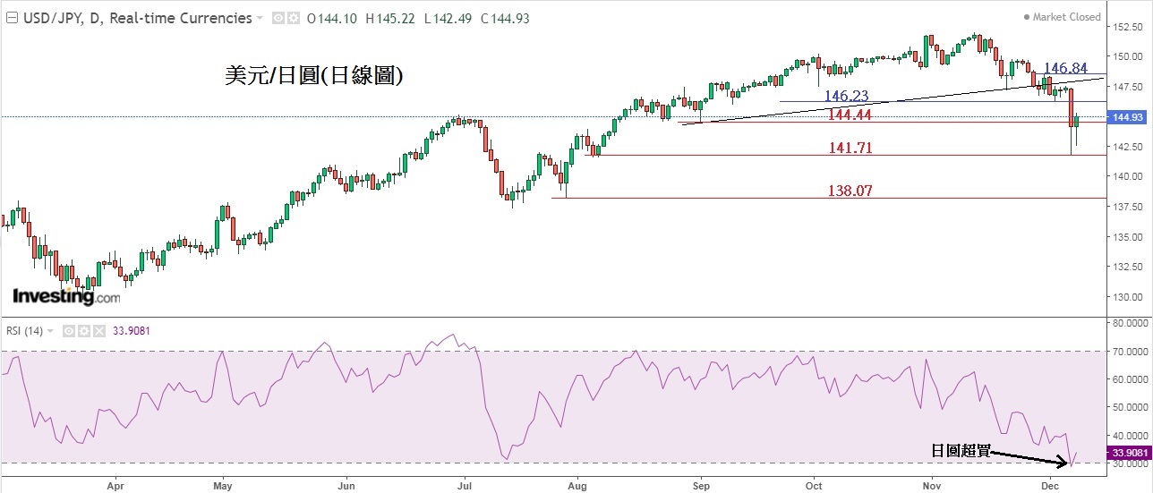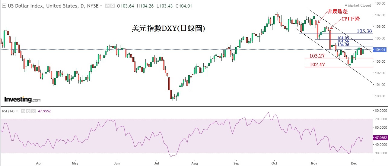 下方是美元指数DXY(日线图),可见到美元指数仍在下降通道内游走,在11月29日美元指数下跌至102.47,RSI 也跌至28,属于超卖水平,因此之后美元作了技术性反弹。至上周五(8日),美国公布了11月非农业新增职位,结果由前值的15万增加至18万,数据稍为造好,提振了美元,因此美元指数周五晚上升,但未有升破下降通道的顶部。本周美元走势,将取决于本周二公布的美国按年是CPI的结果,密切留意当晚公布的结果。