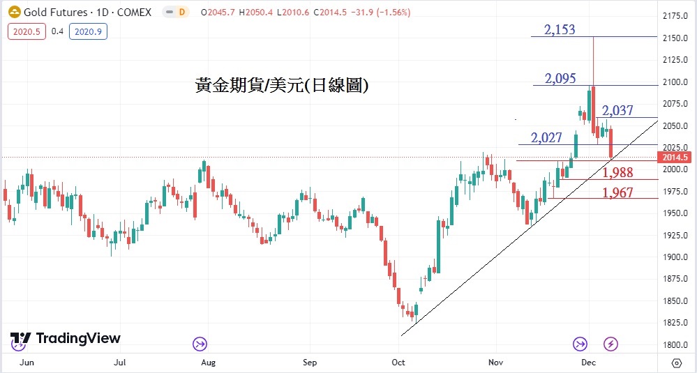 下方是黄金期货/美元(日线图),上周一(4日)期金一开市出现裂口上升,之后冲上2153美元后慢慢回落。黄金急升原因是周日晚(3日)美国军舰卡尼号受到也门胡塞武装部队攻击,因此周一早上金价急升,而且周一是12月期金转仓至2月期金,一般转仓日都经常有裂口高开或低开的情况,2月期金价格比12月期金高20多美元,市场也因此在裂口高开下借势再推升金价。