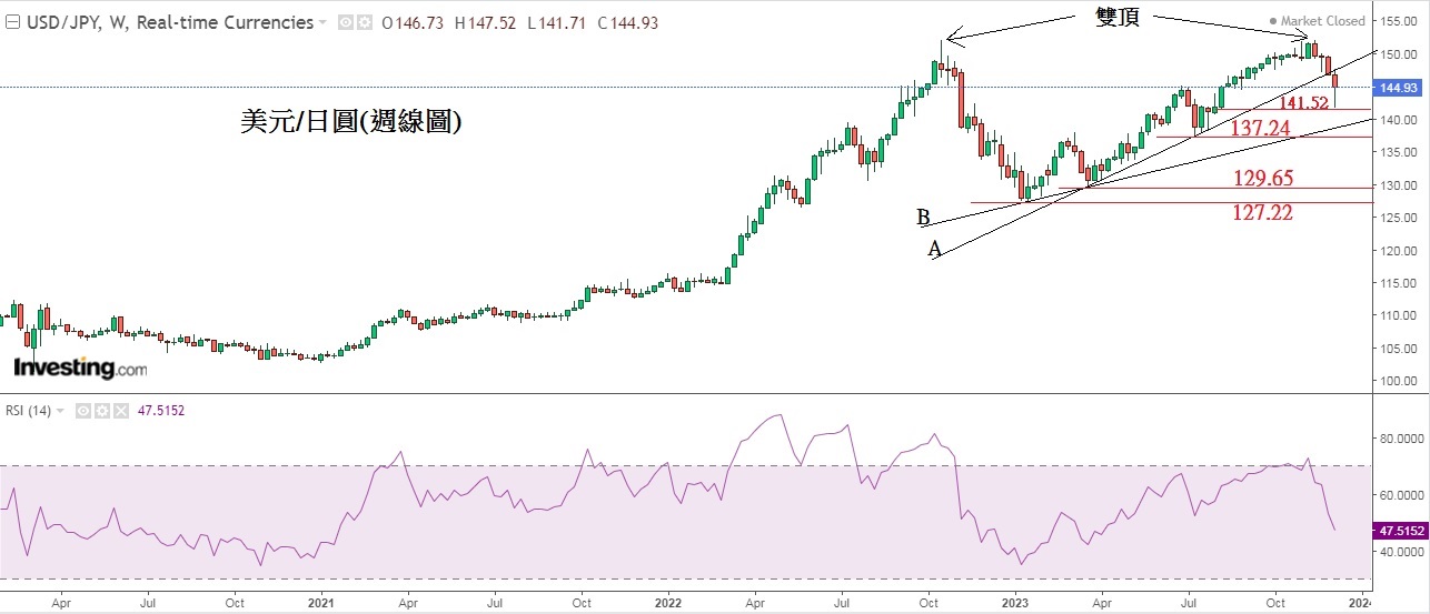 下方是美元/日圆(周线图),从去年10月及今年11月,美元/日圆分别在151水平造了一个大型「双顶」,反映美元/日圆后市走势向下,即是日圆升值。美元/日圆上周已跌破了上升趋势线A,即是美元跌日圆升,下个美元/日圆下跌支持线是上升趋势线B,位置约为美元/日圆140水平,若然140跌破,日圆料可迈向127水平。