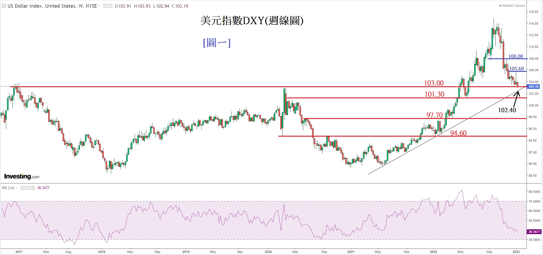 见下方[图ㄧ]美元指数DXY(周线图),图中可见,美元指数跌近上升通道的底部(黑色幼线显示),这个底部的正确位置是102.40,也就是目前的重要支持位。若102.40跌破,金价及非美货币将有显著升势。