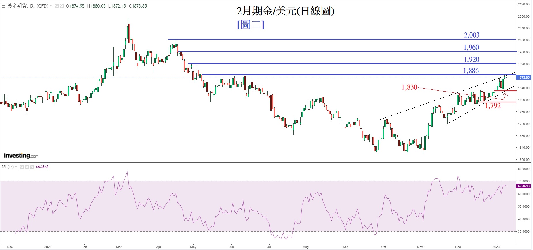 见下方[图二]2月期金/美元(日线图),金价正贴近上升通道顶部(黑色幼线显示),同时与上方的水平线阻力1,886美元(蓝色粗线显示)互相交叠,显示1,886美元为双重阻力。若然升破1,886美元, 预计金价将有凌厉升势。