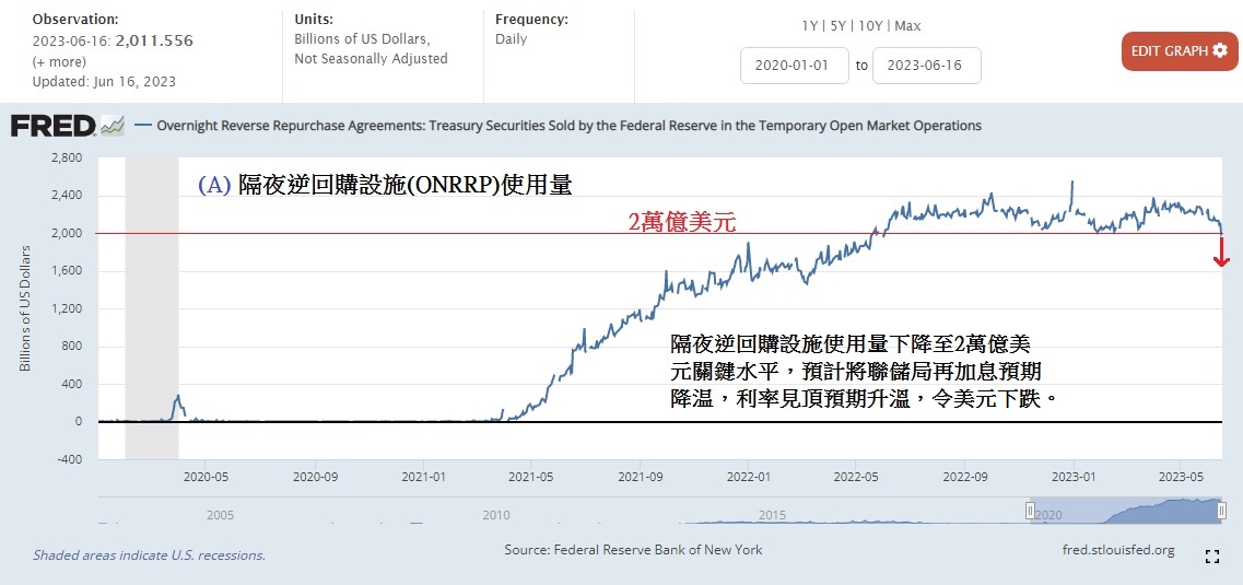 换言之,若ONRRP成交量再进一步下降,美元利率见顶讯号更趋强烈,美元弱势将加剧。