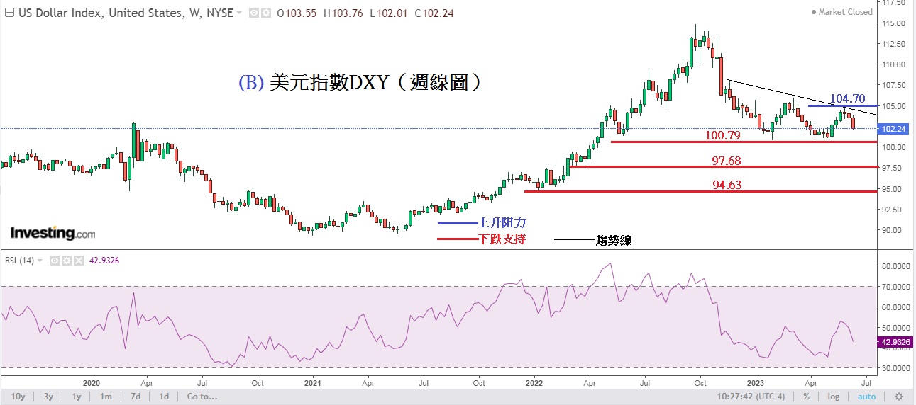 见下方图B美元指数DXY(周线图),美元指数自2022年初组成了一个大型「头肩顶」,显示美元后市大方向看跌。