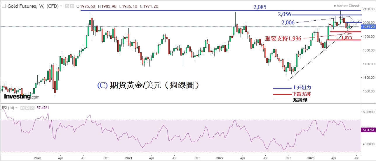 见下方图C期货黄金/美元(周线图),图中可见,上周三晚因联储局「放大鹰」下,金价曾跌穿上升趋势线(黑色幼线),最低见1,936美元,但周四及五金价大幅反弹,返回上升趋势线之上,目前1,936美元成为了本周重要支持位。上周五期金曾升上1,980美元,最后在1,971.20收市,这个9美元的回吐,可能是本周一是美国假期关系,出现了获利回吐。