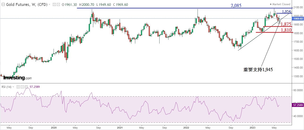 不过,上述所说的是美元看跌的长线观点。在短线而言,美元可能反扑上升。因为,上周五晚(2)美国公布的5月非农业新增职位,原本预测只是增加19万个,但出来的结果是增加33.9万个,市场对这结果感到相当意外,因为美国自去年11月起已出现了裁员潮,至今几乎每月都有大型机构裁员,而且今年美国企业申请破产个案达到13年新高,如今5月突然有33.9万个新增职位,升幅近倍,实在令人费解。无论如何,这是美国官方公布的数字,市场不会考究数据内全职与兼职的比例。举例 : 今年23日公布的1月非农业新增职位结果是51.7万个,但兼职职位增加比全职多了近两倍,兼职职位增加多过全职,反而是经济衰退的讯号,奈何美国劳动部公布的数字是一个综合数字,市场亦只会根据这个数字作出买卖行动。周五晚,「非农」数据公布后,美元大幅反弹,金价及非美货币下跌,反应较大的是黄金, 数据公布后,期货黄金从1,990美元下跌至1,949美元,最后在1,969美元收市。