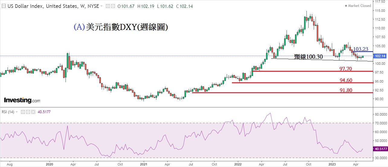 见下方图A美元指数DXY(周线图),美元指数仍在「头肩顶」形态下游走,因此美元后市仍预计向下走,但本周三(3日)联储局加息0.25%预期下,美元短暂受到支持,若周三晚联储局会后声明言论中「放鸽」,料图中黑色幼线的颈线位100.30将跌穿,预计美元将进一步下跌。一旦跌破100.30,美元将有新一轮跌势,金价及非美货币显著上升。
