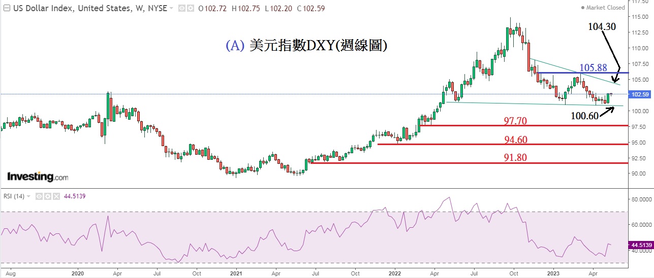技术分析方面, 见下方图A,美元指数DXY(周线图), 美元指数仍在「头肩顶」形态内游走,重要的支持位是「颈线」100.60, 上周未能跌破,因此作了反弹, 留意上方有两个阻力,第1是104.30,第2是105.88。