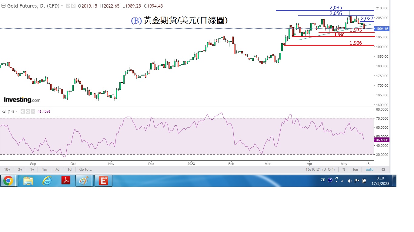 见下方图B黄金/美元(日线图), 金价在本周初跌破了短期上升趋势线, 原因是周一晚(15日)联储局官员卡什噶里(Kashkari)演说中「放鹰」,他是11位有投票权的官员中最鹰派的一位,他发表示通胀仍高企,联储局仍需继续加息,暗示6月需要继续加息,消息令美元反弹,金价及非美货币回落。