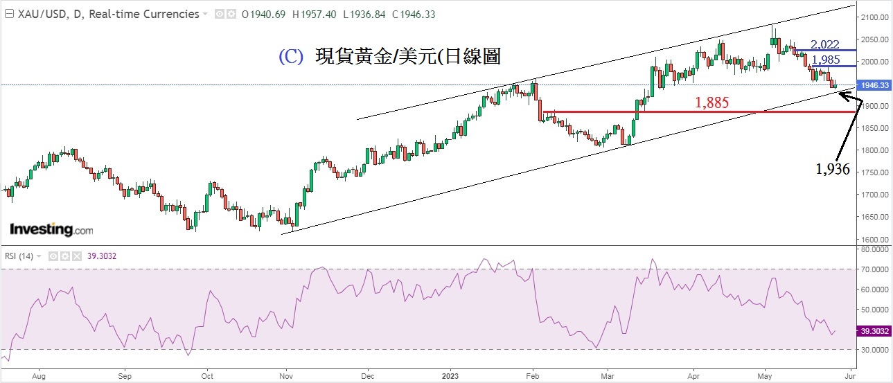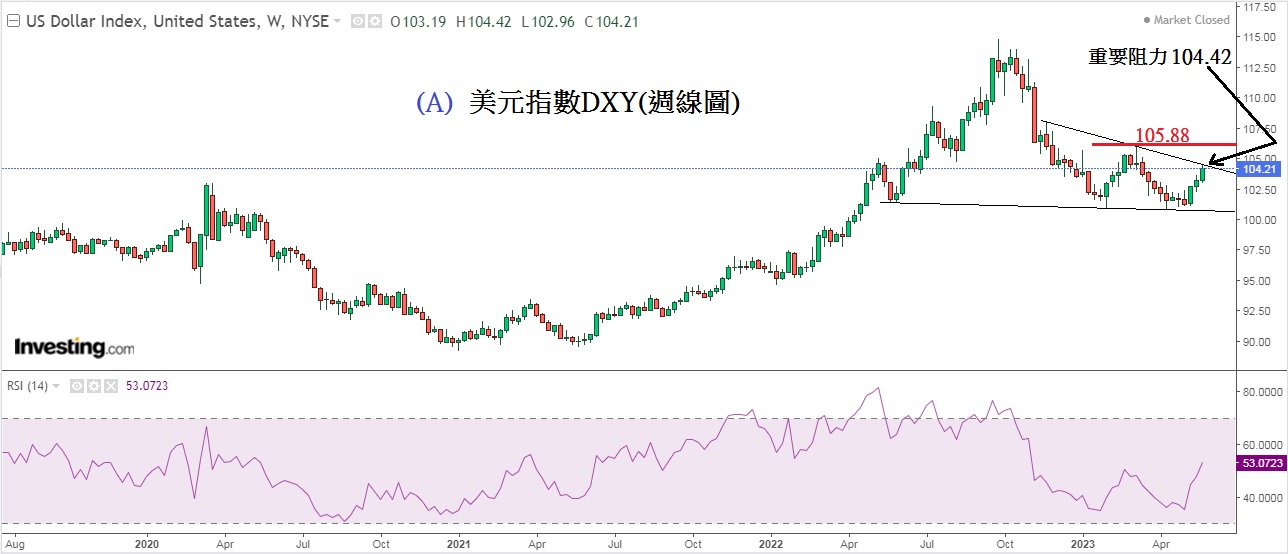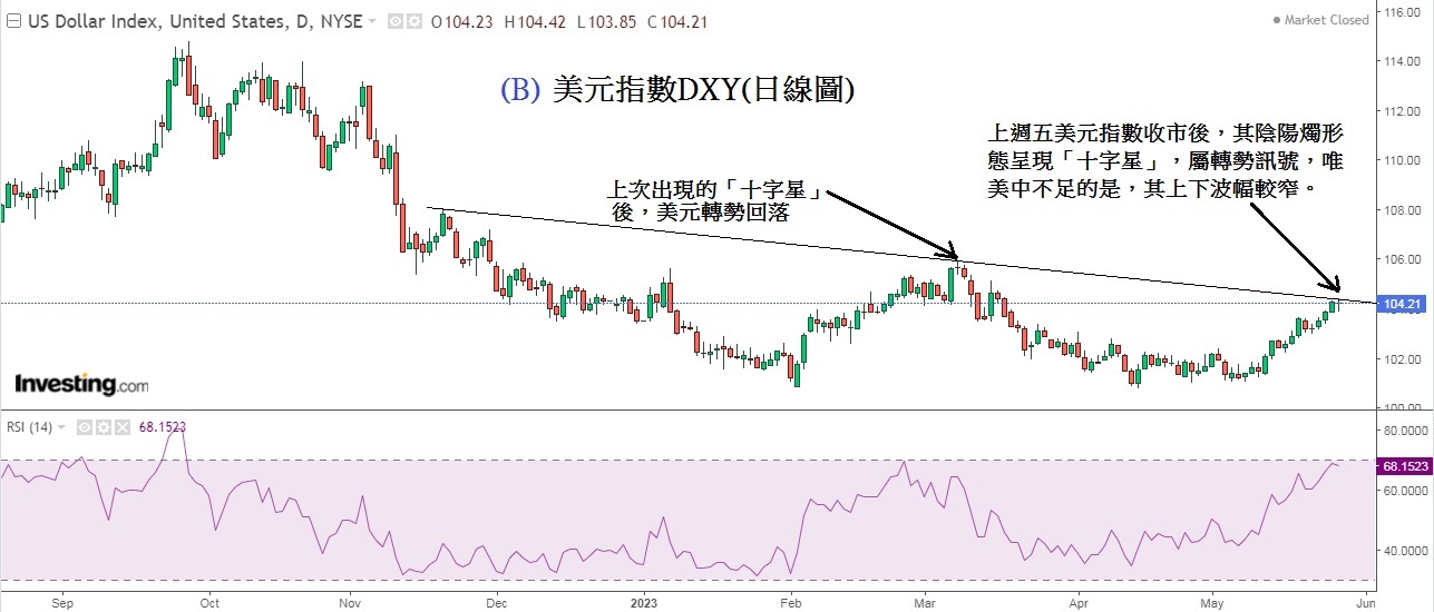 见下图A美元指数DXY(周线图),上周受到联储局盛传再加息气氛及债务危机乐观情绪下,将美元指数推升至重要阻力位,上周五刚升到下降趋势线的顶部,这阻力位置是104.42,本周这阻力位置扮演着重要角色。因为,若然升破104.42,美元指数料上试105.88。相反,这个重要的阻力位若然不能升破,美元将显著地掉头回落,这些行情是过去「破位」与「不破位」的惯常表现。所以,本周密切留意104.42这个重要阻力位。