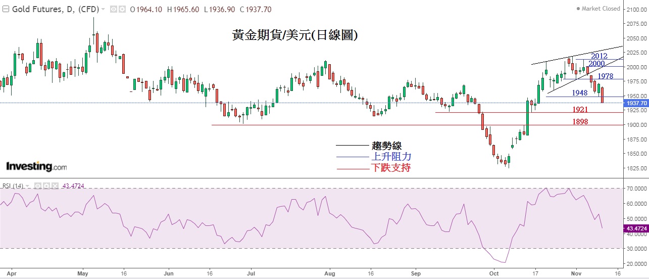 巴以战争虽然持续激烈,但上周因无其他中东国家支持巴勒斯坦如伊朗、黎巴嫩、叙利亚等袭击以色列及驻中东美军事件发生,暂时降低了战事扩大风险,加上鲍威尔放鹰,因此期金上周作出回吐。周五晚(10日)深夜,以军表示与哈马斯就释放人质谈判取得进展,虽然未达成协议,但期金当晚仍进一步下跌,最后在1937美元收市。