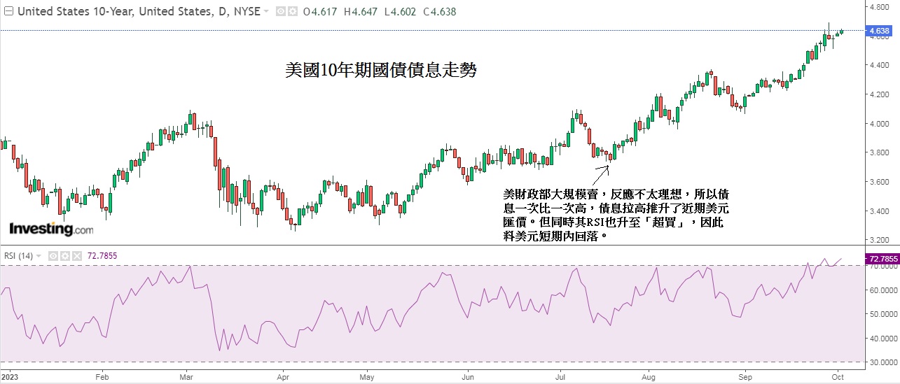 这个原因令每星期卖债债息一次比一次高,从而不断地推高美元汇价,见下方的美国10年期国债债息走势图,可见债息在短短3个月由3.7%升至上周4.6%,升幅接近1%,不过,20年朗美债息升至4.6%RSI也升至72,属超买水平,因此预计债息短期内回落,美元也会下跌。