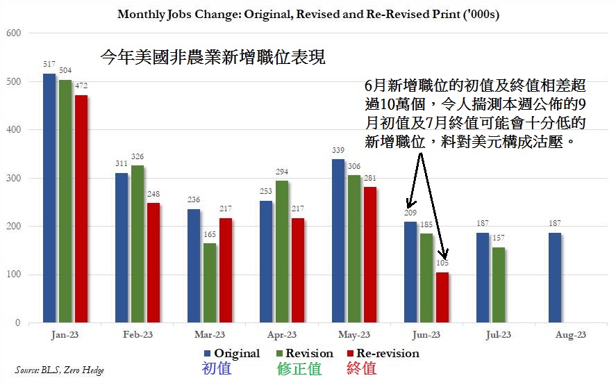 今年1月起,美国劳工统计局(BLS)已将兼职职位计入每月公布的非农业新增职位之内,即是一周只开工几小时也计入新增职位行列(本文在今年2月已报导过)。所以,即使不断的裁员潮下,仍可以看到美国的非农业新增职数字位在今年一直保持住不俗的表现。但丑妇终需见家翁,看到下方今年非农业新增职位走势图,可看到红色的终值每个月都低于蓝色的初值,终值是最反映真实数字,但往往终值是事隔两月后才公布。值得留意的是6月,初值公布是增加20.9万个,但终值只有10.5万个,反映美经济可能在6月开始已急速放缓,可能连兼职职位也大幅减少,因此令6月新增职位的终值有大幅下跌。本周五(6)香港时间晚上20:30 9月非农业新增职位就会公布,目前预测是增加16万个,前值是增加18.7万个。若终结果低于预测,预计对美元构成下调压力。因为非农业新增职位是俱有经济前景预示的数据,也是联储局最抱有信心的数据。