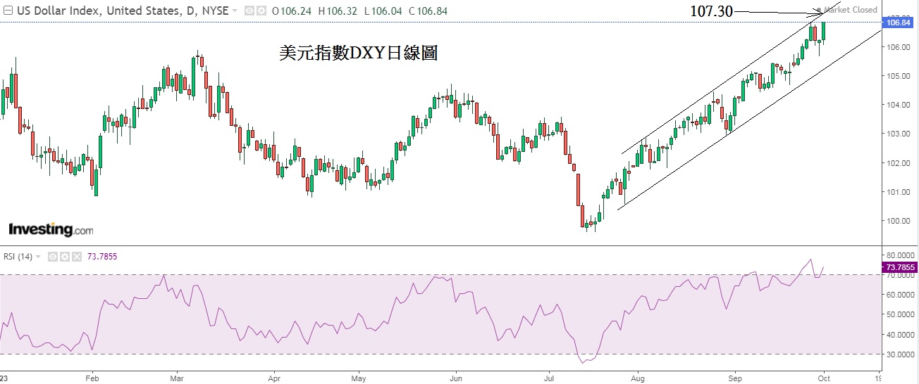 受到美债息不断上升及联储局官员放鹰下,令美元汇价上升,见下方的美元指数DXY日线图图表来看,美元指数仍在上升通道游走,上升阻力是107.30,但RSI 升至70以上,属超买区内,显示美元再上升空间有限,随时有回吐压力,因此看涨美元的投资者要留意。